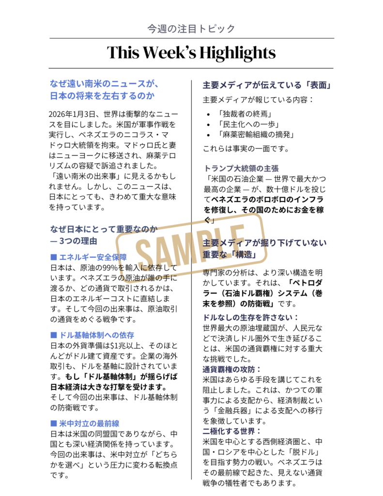 特定の金融商品や思想に誘導することはありません。国際的に信頼されている報道機関や機関データに基づき、知的な誠実さを持って、世界の「構造」を伝えます。