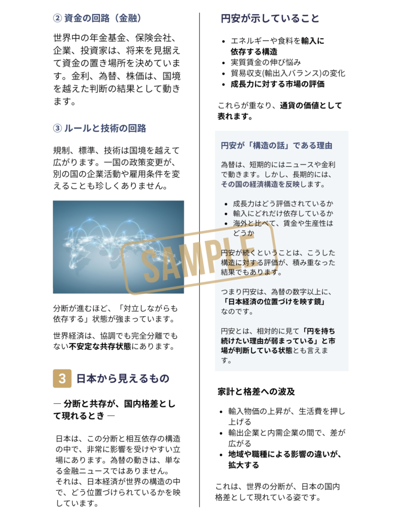「『円安』を単なるニュースではなく、日本経済の位置づけを映す鏡として解説。世界の分断がどのように国内の格差へと繋がっているのか、本質的な視点を共有します。